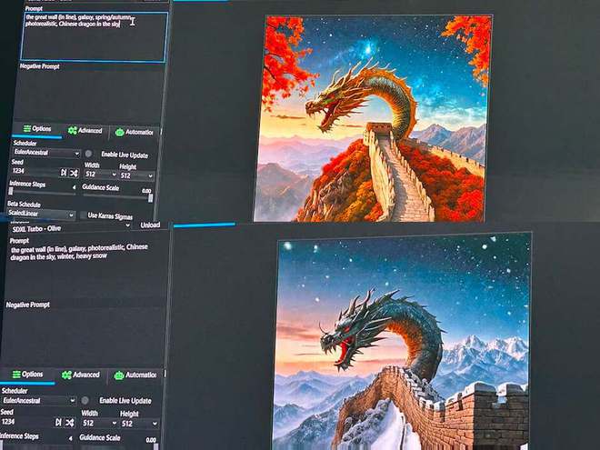 在AI画图环节,技术员通过输入“Chinese dragon in the sky”“winter”“heavy snow”等关键词,就可以及时生成一幅完成度较高的作品。