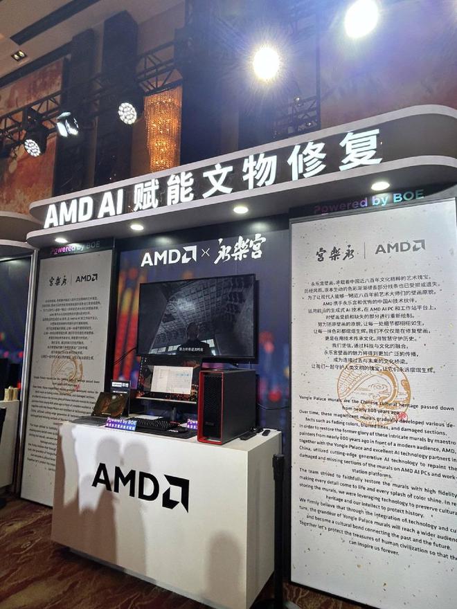 在AMD为中国产业链企业开设的展区中,DoNews也注意到该公司在AI PC领域的最新成果。这其中,除了有包括通义千问专业级的端侧语言大模型、超大规模图形生成应用之外,还有诸如用于文物修复的高精度图像超分算法。