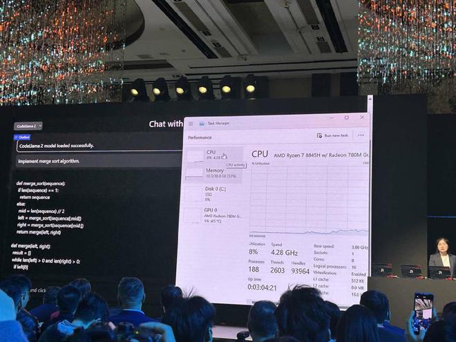 DoNews注意到,在AI写代码环节,AMD展示了笔记本的任务管理器信息,表示CPU和GPU占用都非常低,因为任务是在NPU上运行的。