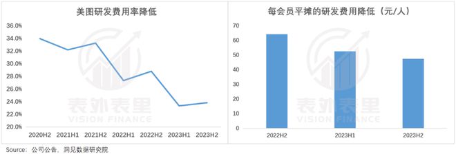 但美图却有些与众不同,大手笔投入下,其研发费用率和每会员平摊的研发费用在持续降低,这说明公司的研发效率在不断提升。