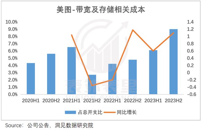 其中,带宽及存储相关成本在2023H2同比增长110%,占总开支的比例进一步走高到9%。
