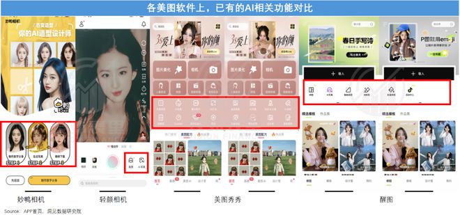 以生活场景为例,截至目前,美图秀秀上线了AI绘画、AI扩图、AI头像等近十个AI应用功能;醒图推出了AI写真和智能抠图;妙鸭相机和轻颜相机,则专供AI写真。