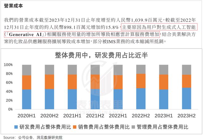 以美图为例,财报显示,因为AI相关云计算服务费的增加,营业成本居高不下。此外,这一季的研发费用,在整体费用中占比也高达49%,是连续9个季度以来的最高值。
