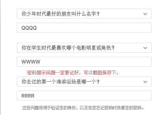 安全提示问题设置一定要记住保存好,可以截图保存。