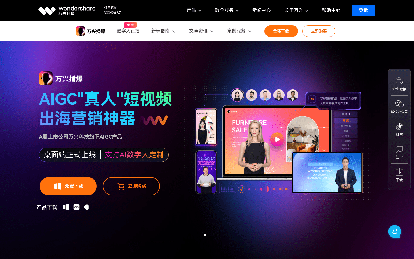 万兴播爆是 A 股上市公司万兴科技旗下的 AIGC 产品,为您提供 AI 数字人定制服务。只需简单输入关键词,即可轻松生成真人营销视频。万兴播爆拥有上百套专业级模板,涵盖各种场景视频需求,是您出海视频营销的一站式神器。它支持 AI 智能脚本生成,文本转语音,拥有 150 + 免版权多国籍数字人,120 + 标准语言声音,180 + 专业级模板,免版权音乐资源库,海量视频创作素材,1080P 高清视频导出等功能。万兴播爆可广泛应用于家居生活、企业宣传、打折促销、美妆护肤、产品介绍等场景。